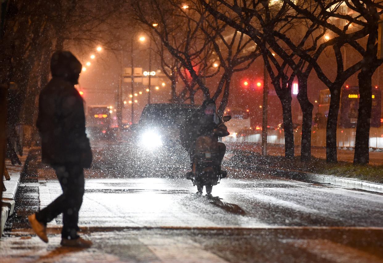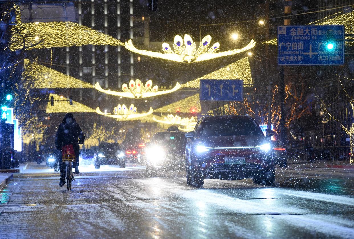 1月17日,市民在北京金融街冒雪出行。新华社记者 罗晓光 摄