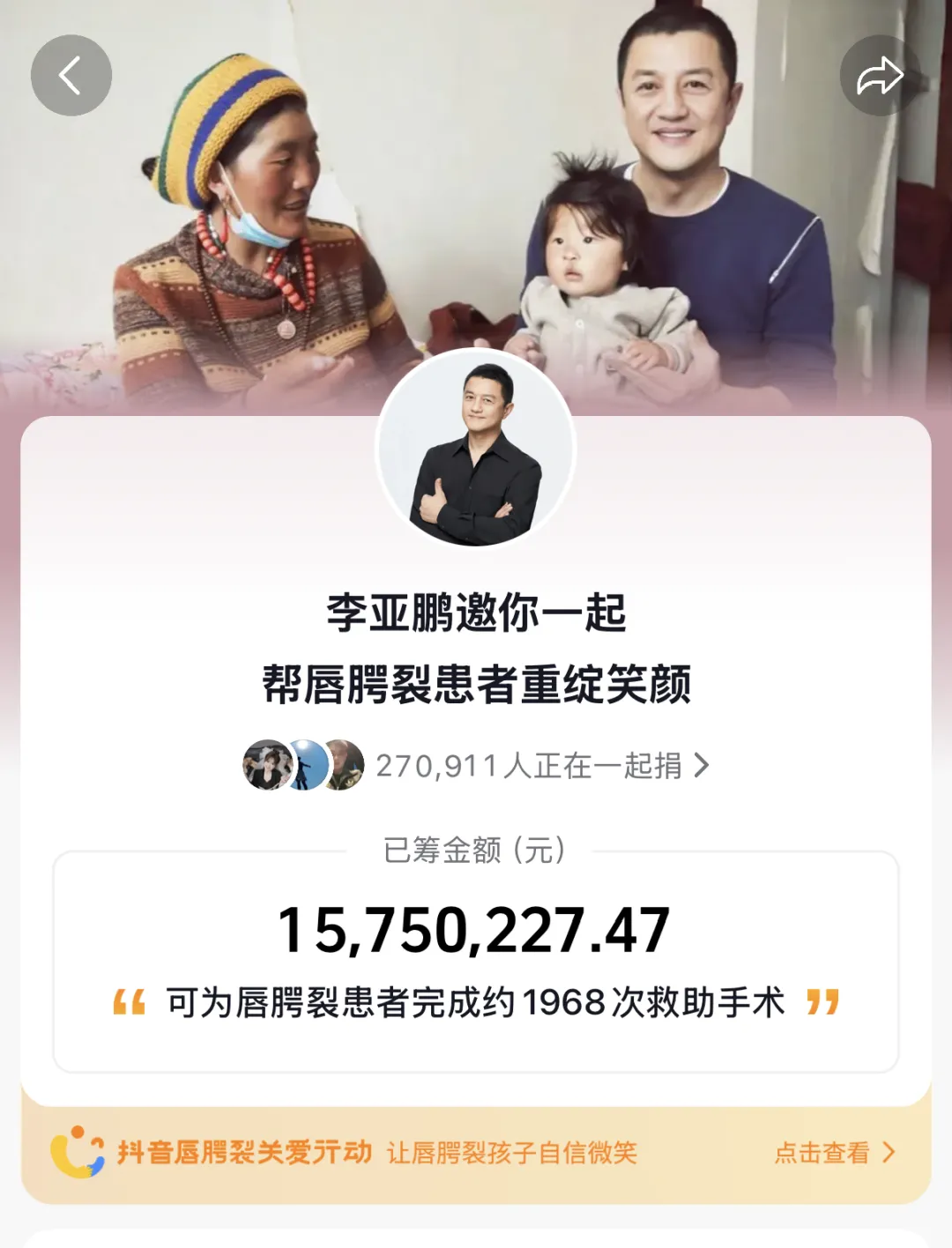 1月13日,北京嫣然天使儿童医院房租债务问题引发网络关注。1月14日晚,李亚鹏在社交平台发布一段名为《最后的面对》采访视频,详细解答了北京嫣然天使儿童医院因拖欠2000万租金而面临迁址甚至关停的经过与感想,视频发布后爆火,大量网友涌入直播间支持李亚鹏,捐款数已超1570万。