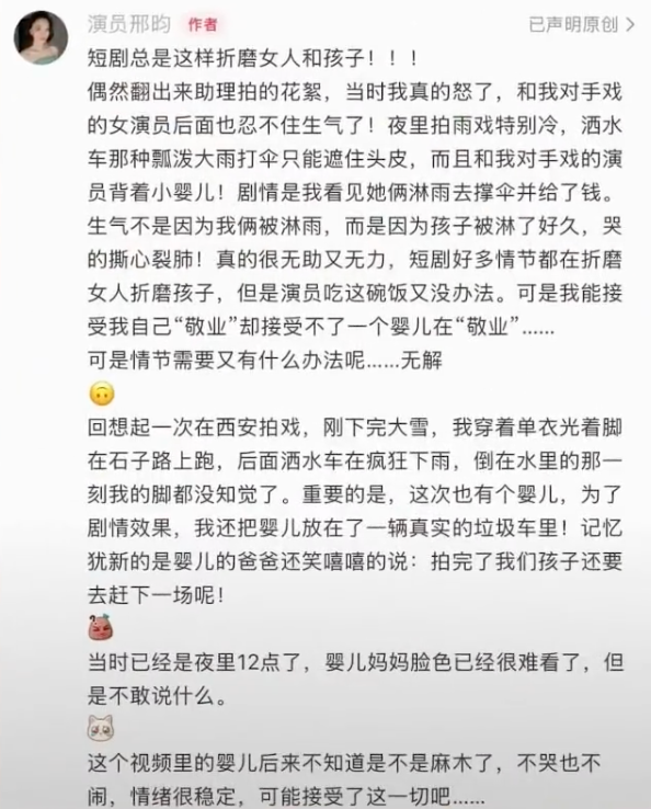 1月17日,短剧演员邢昀发文吐槽某剧组夜里拍雨戏,一直让孩子淋洒水车制造的瓢泼大雨。