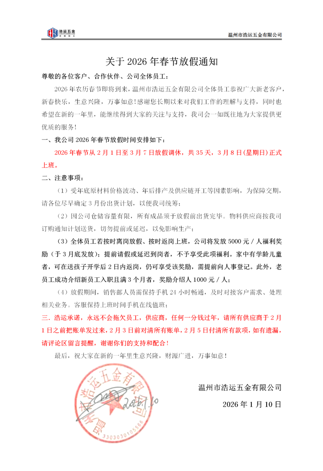 1月10日,浩运五金发布了2026年春节放假安排,2月1日至3月7日放假调休,共35天。全体员工若按时离岗放假、按时返岗,公司将发放每人5000元的福利奖励,奖金于3月底发放。另外,家里有学龄儿童的员工,可在孩子开学后两天内返岗,同样能享受这项奖励。