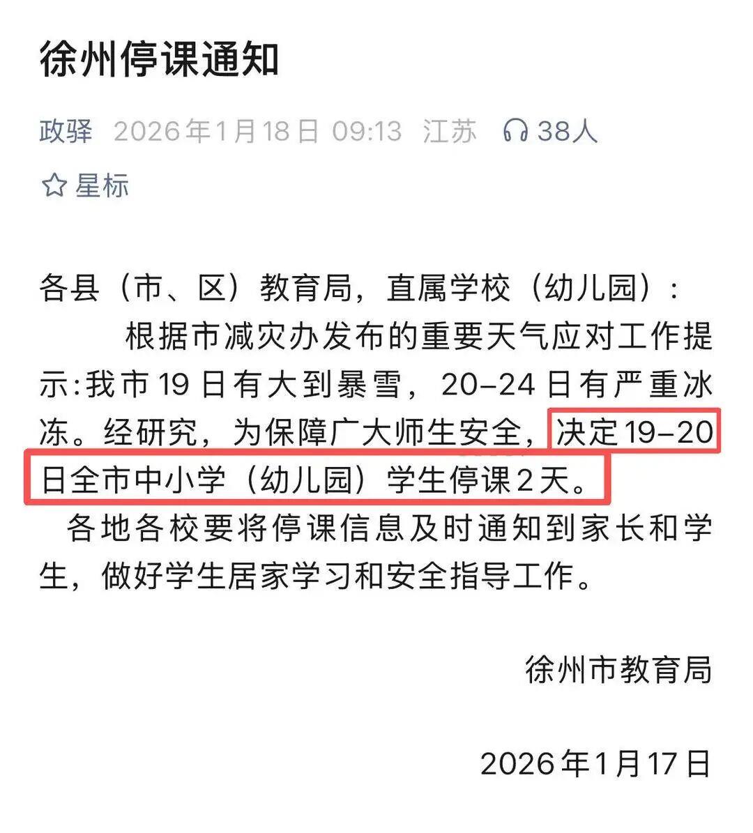 除了河南多地,1月18日早上,江苏徐州市教育局发布通知,根据市减灾办发布的重要天气应对工作提示:该市19日有大到暴雪,20—24日有严重冰冻。经研究,为保障广大师生安全,决定19—20日全市中小学(幼儿园)学生停课2天。