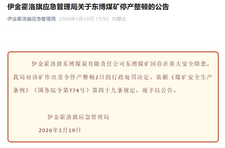 1月19日,内蒙古伊金霍洛旗应急管理局发布公告: