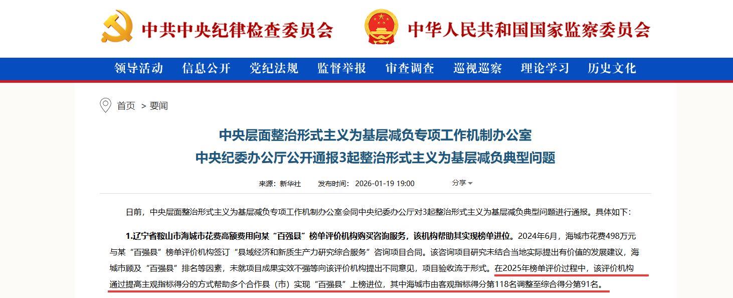 通报提到,2024年6月,海城市花费498万元与某“百强县”榜单评价机构签订“县域经济和新质生产力研究综合服务”咨询项目合同。该咨询项目研究未结合当地实际提出有价值的发展建议,海城市顾及“百强县”排名等因素,未就项目成果实效不强等向该评价机构提出不同意见,项目验收流于形式。在2025年榜单评价过程中,该评价机构通过提高主观指标得分的方式帮助多个合作县(市)实现“百强县”上榜进位,其中海城市由客观指标得分第118名调整至综合得分第91名。