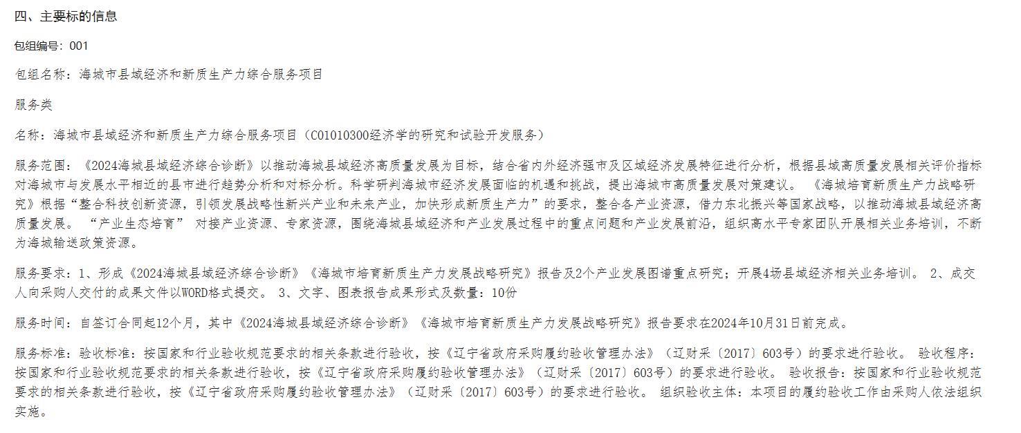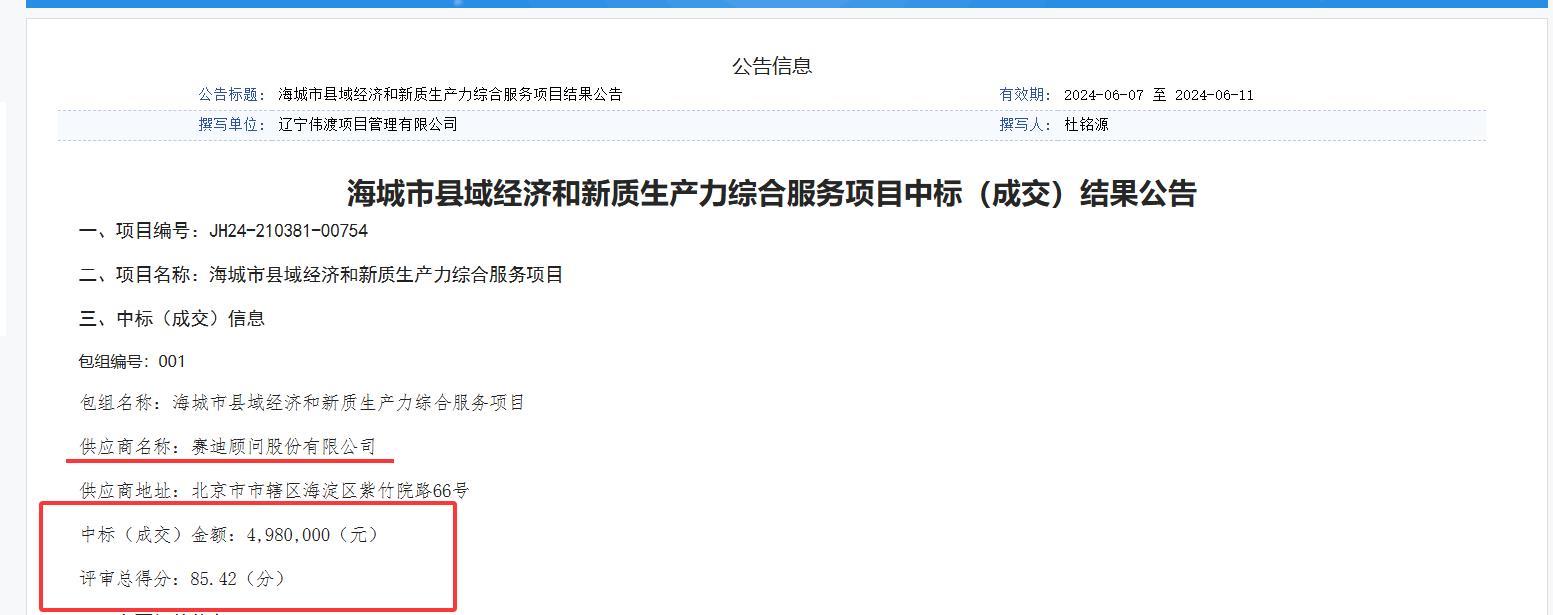 极目新闻记者通过查询辽宁政府采购网获悉,2024年6月,赛迪顾问股份有限公司以总得分85.42分,中标“海城市县域经济和新质生产力综合服务项目”,中标(成交)金额为498万元。项目采购方为海城市工业和信息化局。