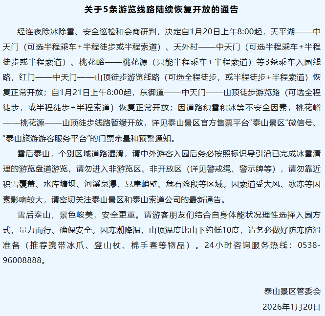 经连夜除冰除雪、安全巡检和会商研判,决定自1月20日上午8:00起,天平湖——中天门(可选半程乘车+半程徒步或半程索道)、天外村——中天门(可选半程乘车+半程徒步或半程索道)、桃花峪——桃花源(只能半程乘车+半程索道)等3条乘车入园线路,红门——中天门——山顶徒步游览线路(可选全程徒步,或半程徒步+半程索道)恢复正常开放;自1月21日上午8:00起,东御道——中天门——山顶徒步游览路(可选全程徒步,或半程徒步+半程索道)恢复正常开放;因道路积雪积冰等不安全因素,桃花峪——桃花源——山顶徒步线路暂缓开放,详见泰山景区官方售票平台“泰山景区”微信号、“泰山旅游游客服务平台”的门票余量和预警通知。