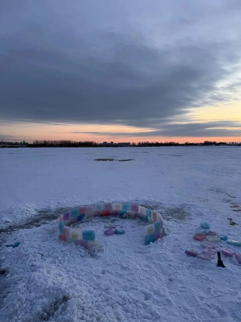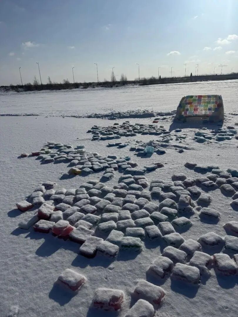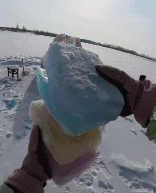 没有任何搭建经验的她,凭着健身教练的体能底子,化身“冰雪瓦工”。在冰面上就地钻孔取水,倒入模具后添加食用级色素,冻成一块块五彩冰砖。为了让冰屋更透光、更浪漫,她特意选择竖着码放冰砖,还坚持设计难度更高的圆弧顶结构,像搭积木一样盖起“窝窝头”模样的小屋。可不承想,因起圈太小、地基未打牢,垒到一半的冰屋又小又矮。