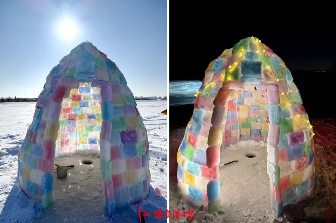 据哈尔滨日报,近日,呼兰区菜园子渔村江段冰层上,“长”出一间五彩缤纷的小冰屋。夜晚的彩灯透过冰砖,在白雪皑皑的天地间散开一片浪漫光晕。谁能想到,曾因搭建中途“翻车”,被网友戏称为“冰上茅楼儿”的这间冰屋,却意外走红,至今仍被无数网友“云监工”和游客慕名打卡。