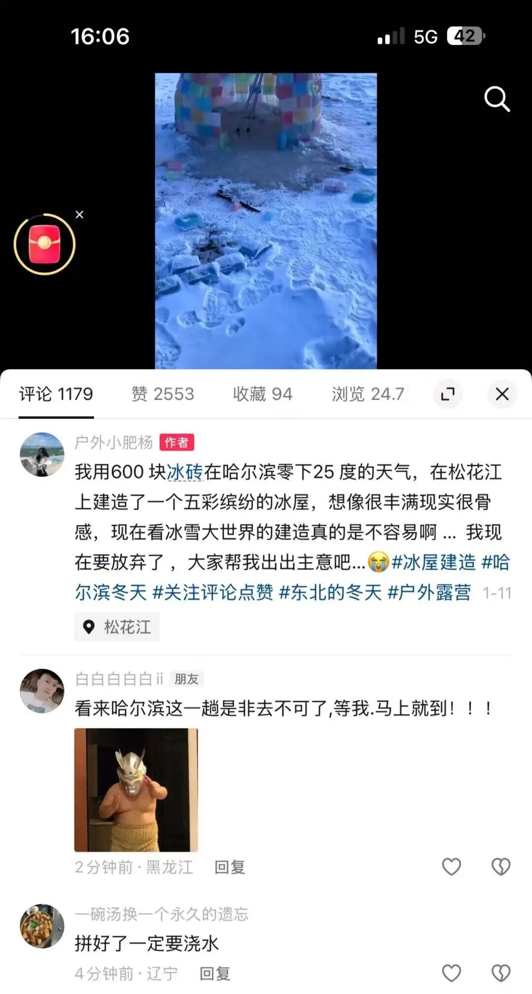 她随手将这略显狼狈的“翻车”画面发上网,本想记录真实生活,却收获了满屏的善意与鼓励。“哈尔滨人玩冰,是动真格的啊!”,网友们笑着调侃这个半成品是“冰上茅楼儿”,纷纷留言支招:“安个帘子保护隐私”“装个加热座便更贴心”“外层罩个大帐篷保暖”。“看到大家这么感兴趣,尤其是南方游客对冰雪的向往,我更坚定了要把冰屋建好的决心。”杨女士说,陌生人的喜爱和默默支持给了自己无穷动力。