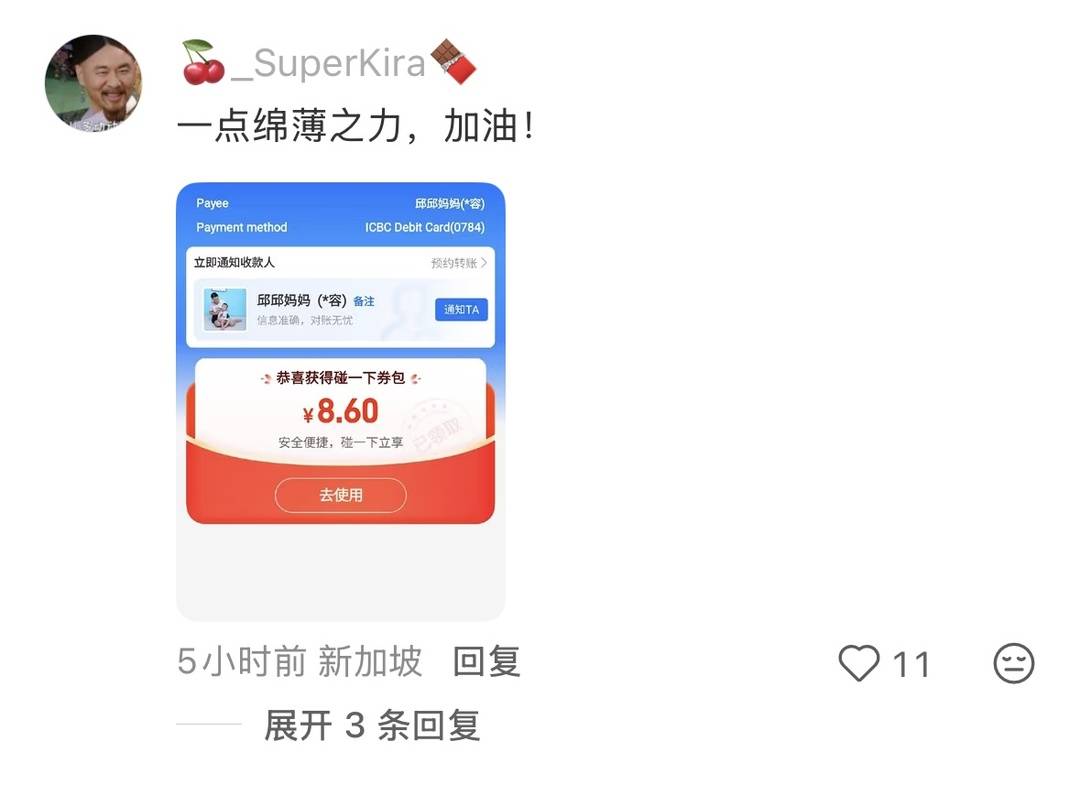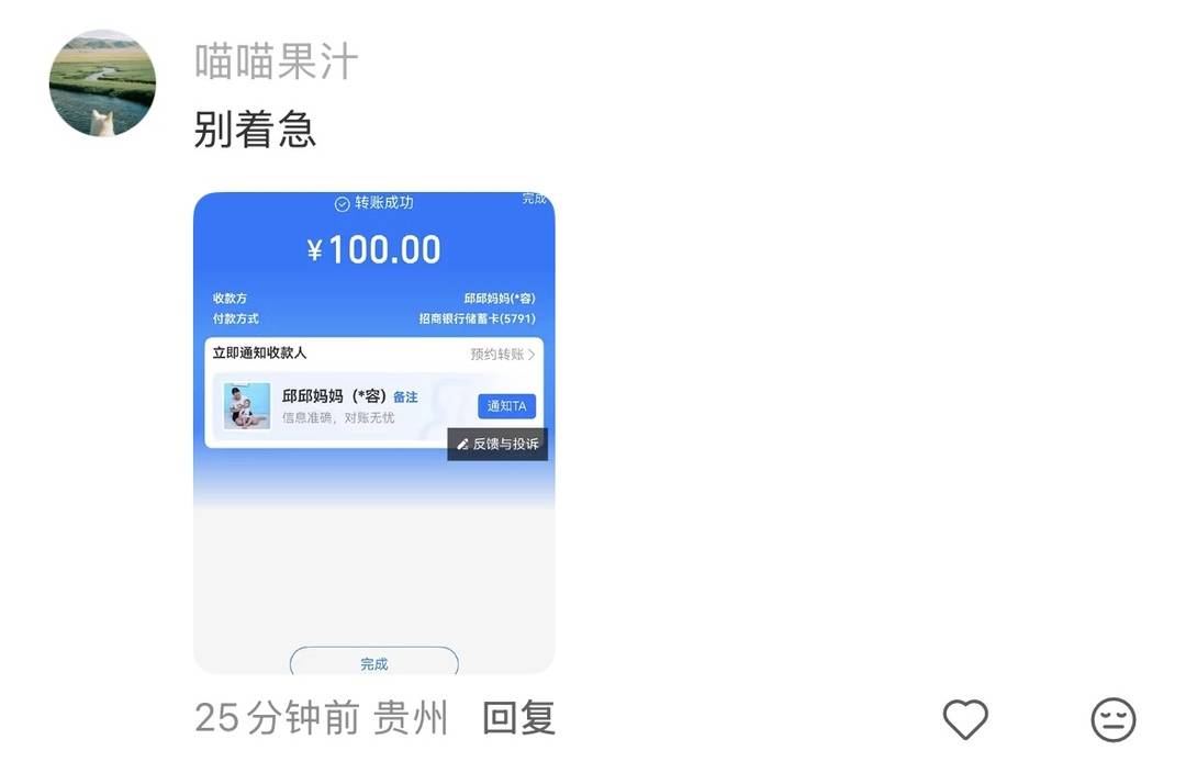 就在刘女士在自己的社交账号上发布了求助后,网友们也伸出了援手。记者注意到,在这条求助的评论区里,有住在附近的网友询问刘女士当天的具体路线,表示会帮忙留意;有人把求助信息转发到小区业主群里;有人建议联系环卫公司;还有网友晒出了转账记录,50元、100元、200元,这些网友的ID来自北京、贵州、四川、新加坡……