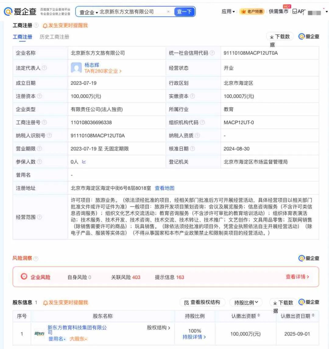 爱企查App显示,北京新东方文旅有限公司成立于2023年7月,法定代表人为杨志辉,董事长为俞敏洪,注册资本10亿元人民币,经营范围包括旅游业务、教育咨询服务(不含涉许可审批的教育培训活动)、文化艺术交流、组织体育表演活动等,由新东方教育科技集团有限公司全资持股。