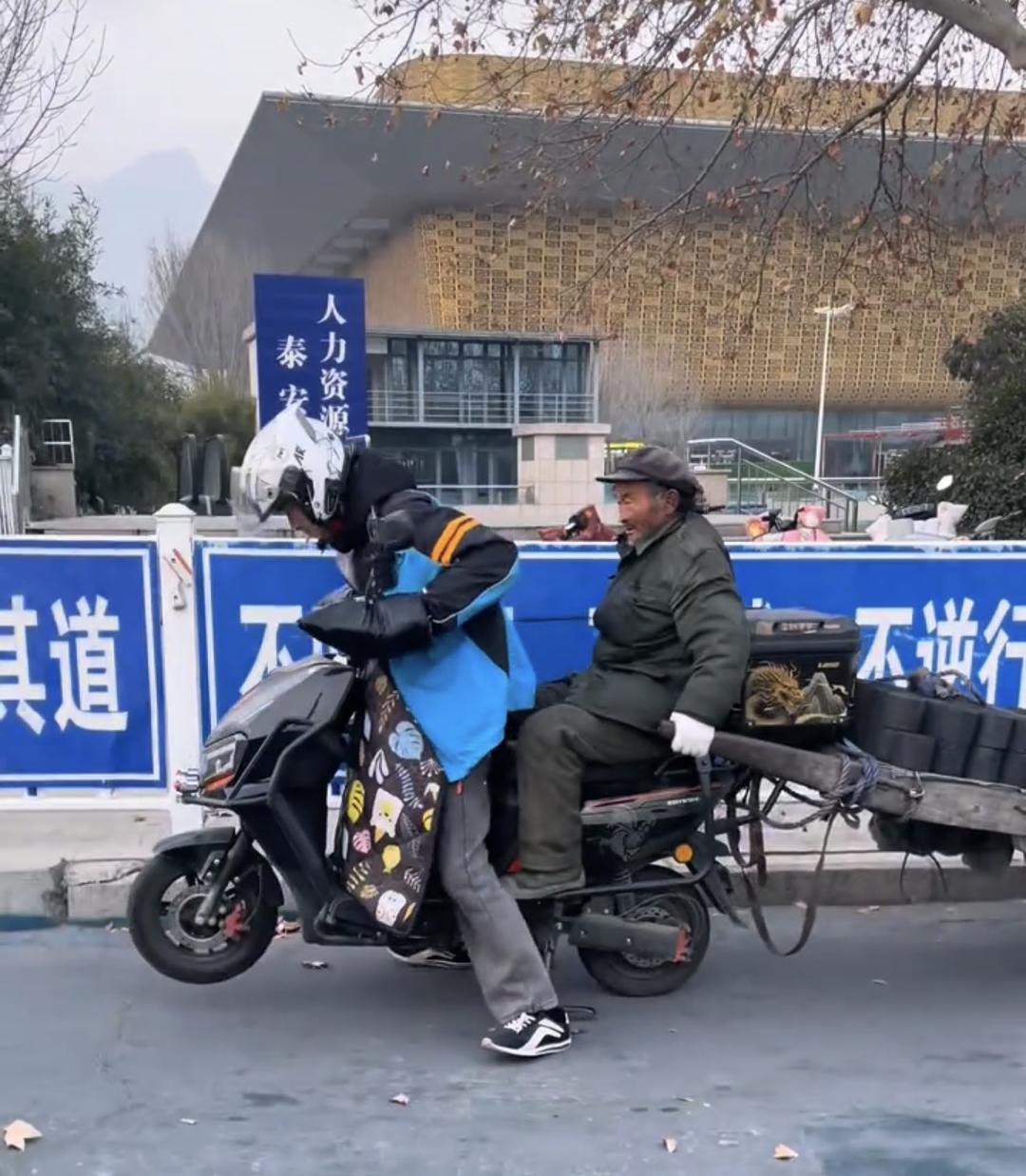 在老人快到达与泰山大街时,一位途经的外卖小哥停到了老人前面。将老人肩上的拉绳绑到自己的电瓶车上,又将老人扶到自己的后座,随后上车缓慢地起步行驶,将老人载到离此地三千米远的光彩大市场。