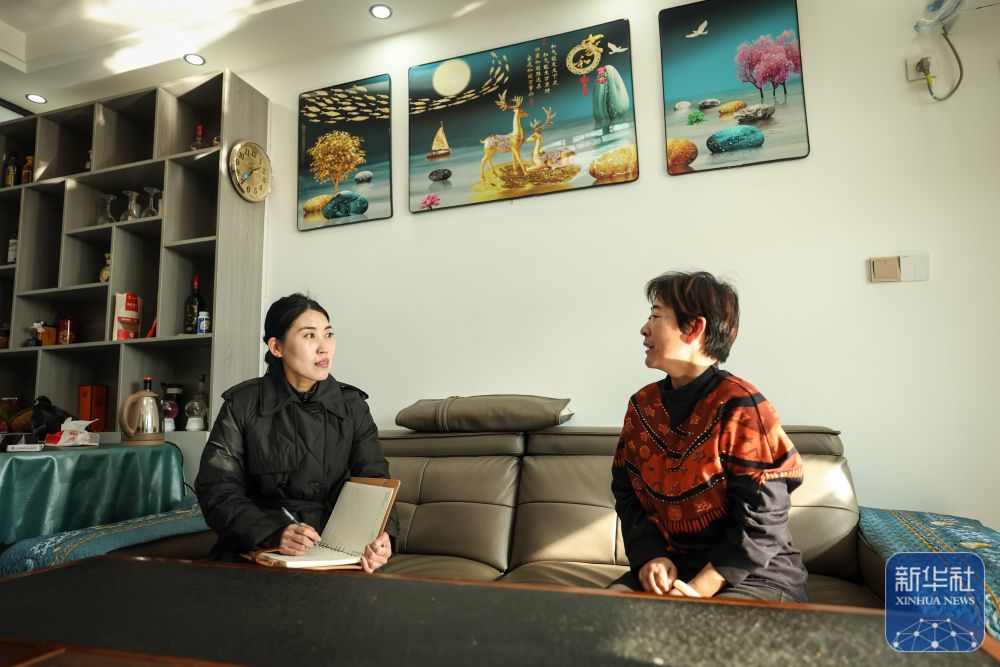 ↑1月20日,祝家沟村党支部书记王丽丽(左)在村民家了解近期生活情况。新华社记者潘昱龙摄