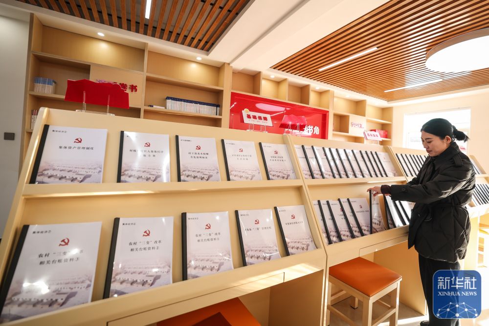 ↑1月20日,祝家沟村党支部书记王丽丽在祝家沟村党群服务中心活动室内整理展示的资料。新华社记者潘昱龙摄