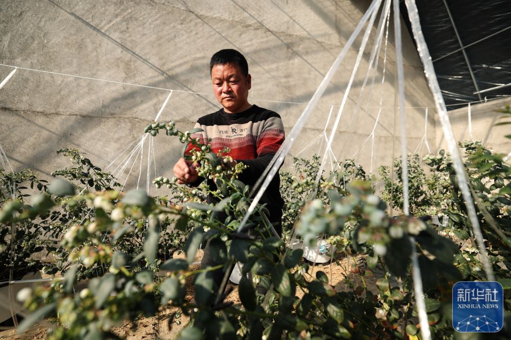 ↑1月20日,村民在祝家沟村新建的高标准蓝莓大棚内进行日常维护工作。新华社记者潘昱龙摄