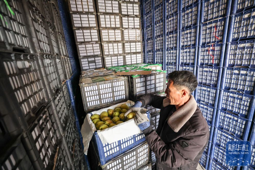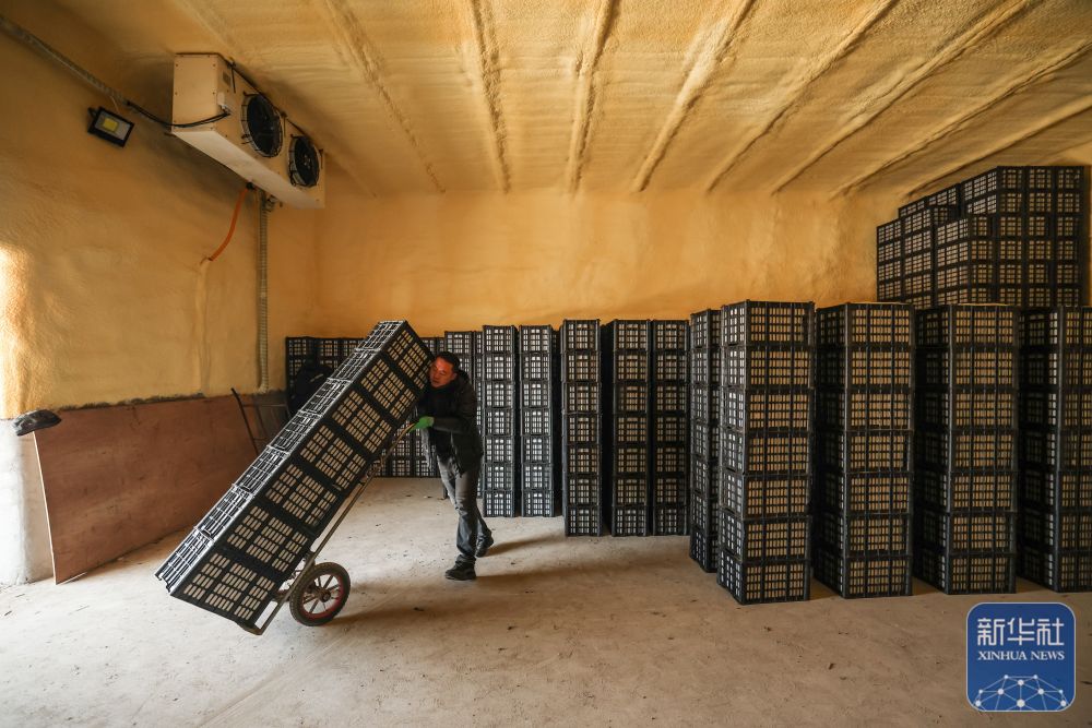 ↑1月20日,村民在祝家沟村新建的恒温库内搬运水果。新华社记者潘昱龙摄