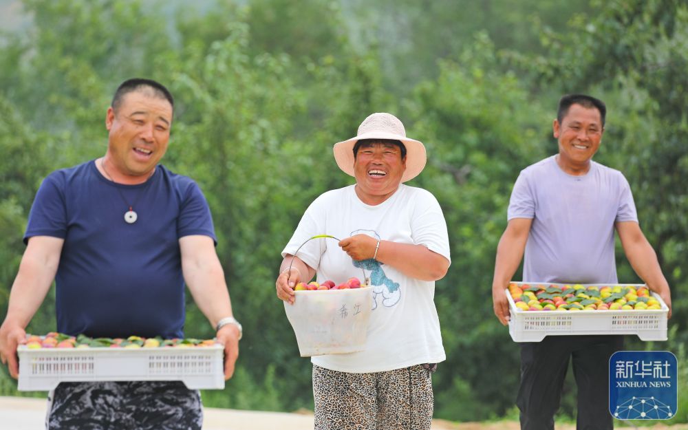↑村民在果园采收李子(2025年7月2日摄)。新华社发(田嘉摄)