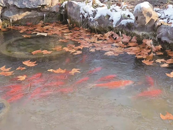 玄武湖结冰,冰下锦鲤游不停 现代快报/现代+记者 赵杰 摄