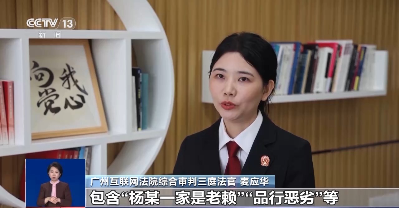 广州互联网法院综合审判三庭法官 麦应华:将头像所在主页背景设置为“厚颜无耻”,并在账号内发布多条包含“杨某一家是老赖”“品行恶劣”等内容的造谣、辱骂视频。除此之外,被告还主动关注杨某的同学、好友的社交账号并留言扩散谣言,导致不明真相的师生对杨某产生误解,使其遭受孤立、嘲笑,正常学习生活受到严重干扰。