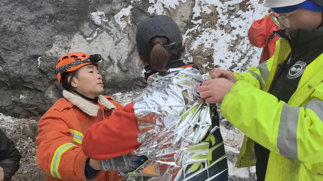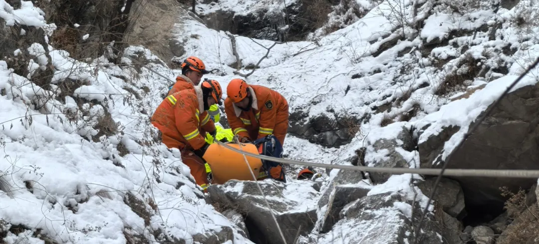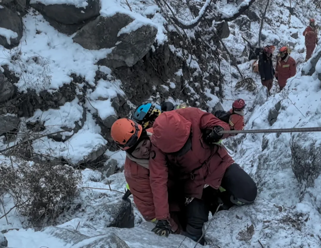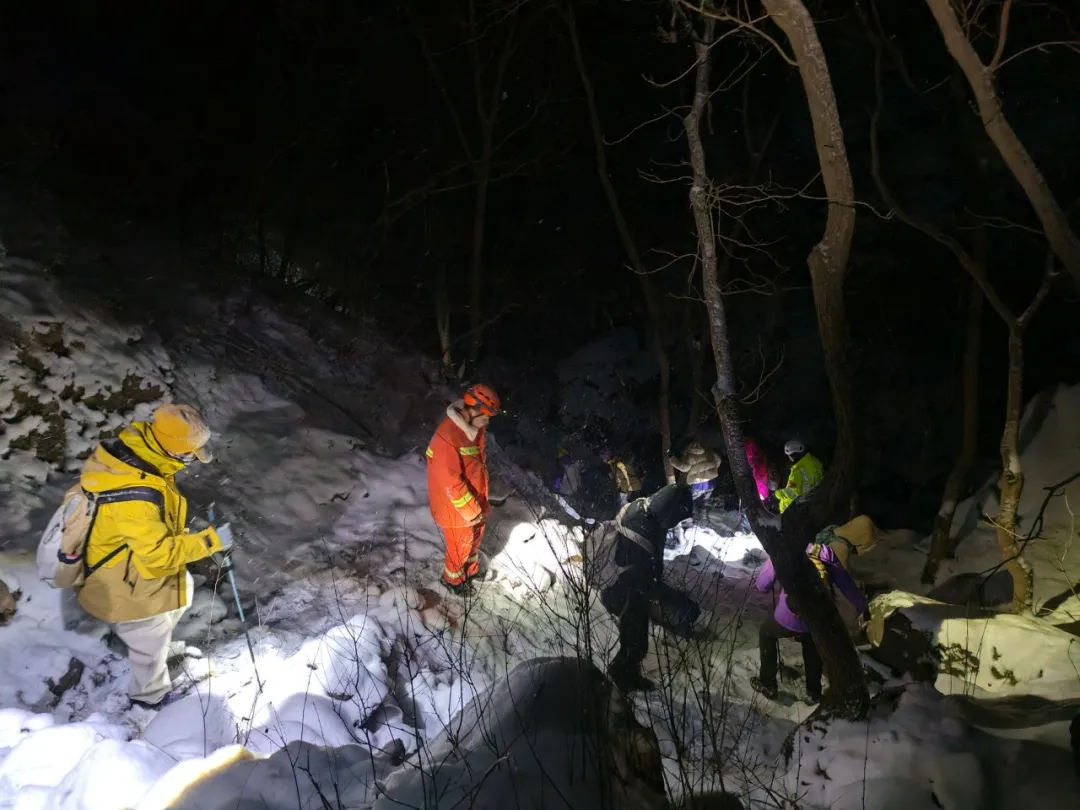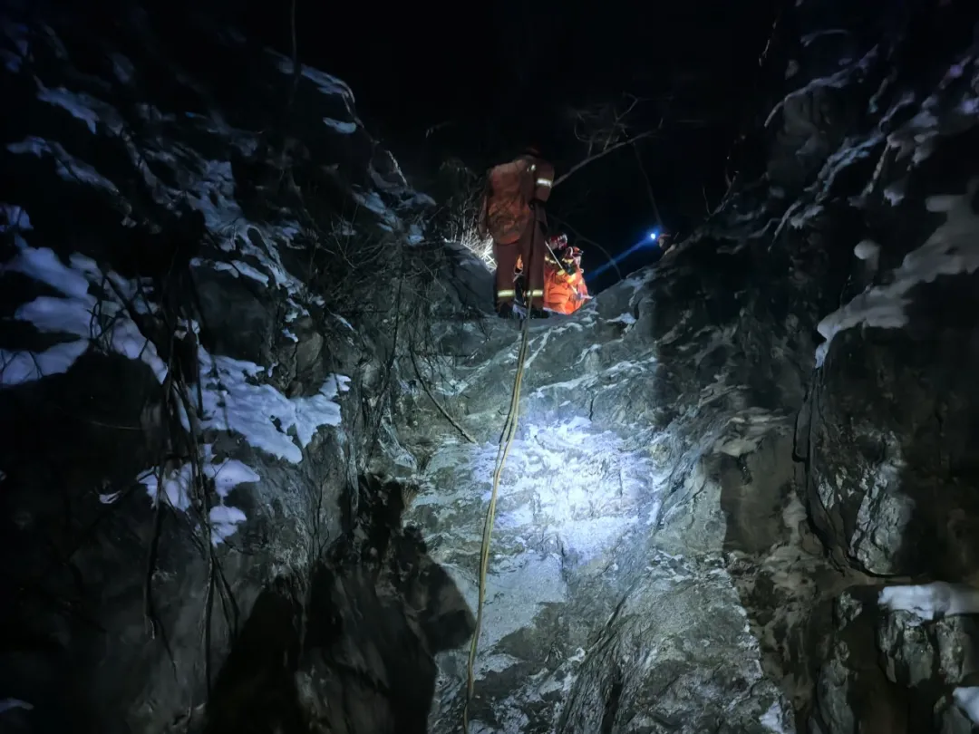 18日凌晨3时许,前突消防员在滑降两处断崖后,终于听到被困者的呼救声,救援人员加快行进速度。凌晨5时左右,消防员行至被困者上方约40米高的断崖处,当时消防员的冰爪断裂报废,且绳索距离不足,反复尝试仍无法安全下降。全勤指挥部调集潭柘寺消防救援站的队员携带冰爪、绳索等装备前往增援。