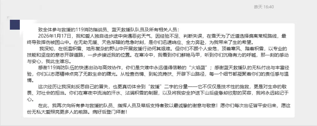 门头沟消防郑重提示:出行前务必查询目的地详细天气预报,遇有降雪、大风、降温等恶劣天气,严禁进入野山;选择正规、成熟的登山路线,提前规划行程并告知亲友,控制好登山强度,量力而行;如果要穿行冰雪地带,应携带防滑鞋、冰爪、绳索、保暖衣物、急救包等专业装备,并备好足量食物和热水,增强御寒和应急能力。