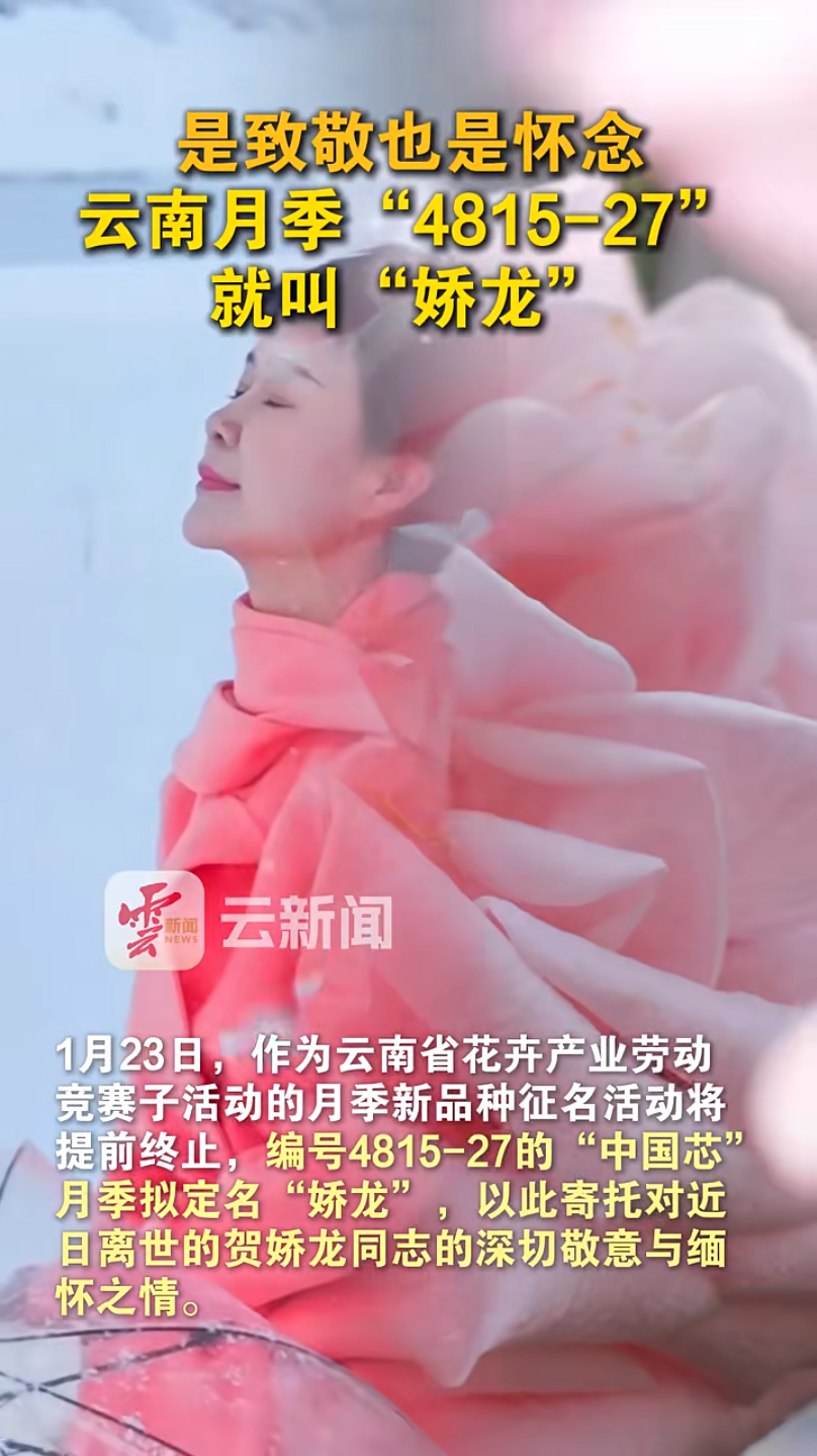 1月23日,记者获悉,作为云南省花卉产业劳动竞赛子项目的月季新品种征名活动将提前终止,编号4815-27的“中国芯”月季拟定名“娇龙”,以此寄托对近期离世的贺娇龙同志的深切缅怀与崇高敬意。