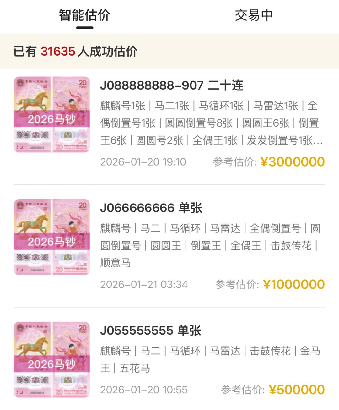 潮新闻记者查询了一个规模较大的钱币交易平台,显示编号从J088888888开始的二十连张马钞,参考估值高达300万元。此外,像J066666666,J055555555等靓号也身价不菲,分别估价为100万元、50万元。