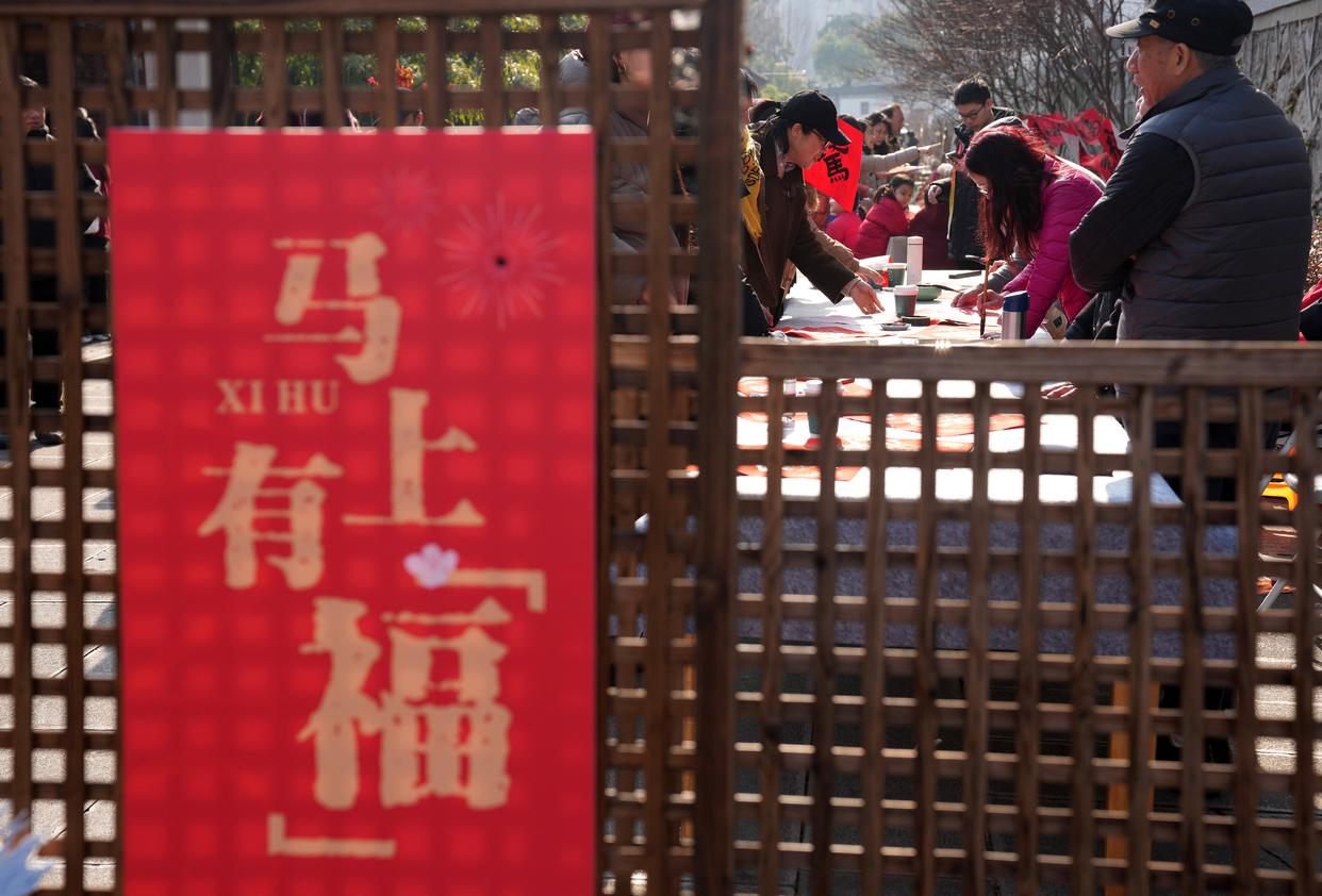 1月23日,书法爱好者在活动现场为社区居民写福字和春联。新华社记者 韩传号 摄