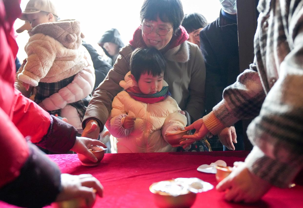 1月23日,社区居民在活动现场领取腊八粥。新华社记者 韩传号 摄
