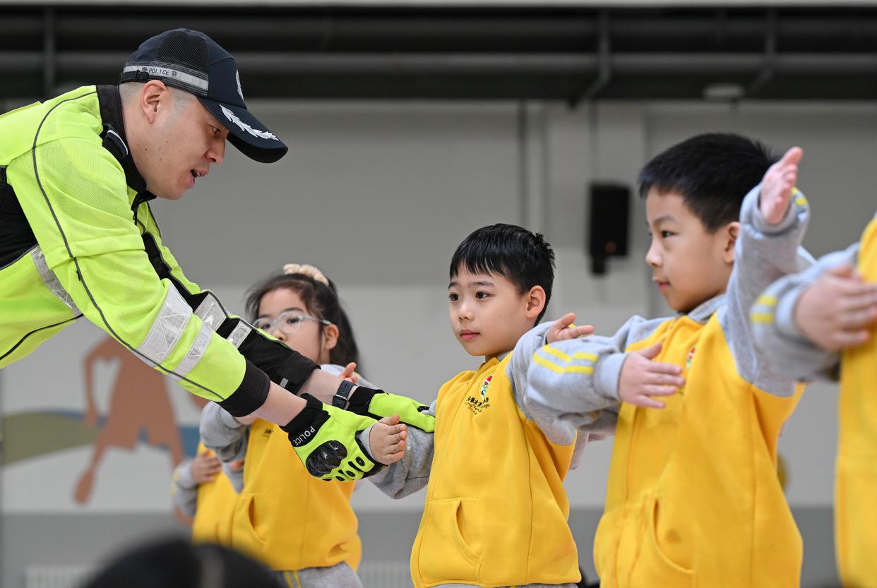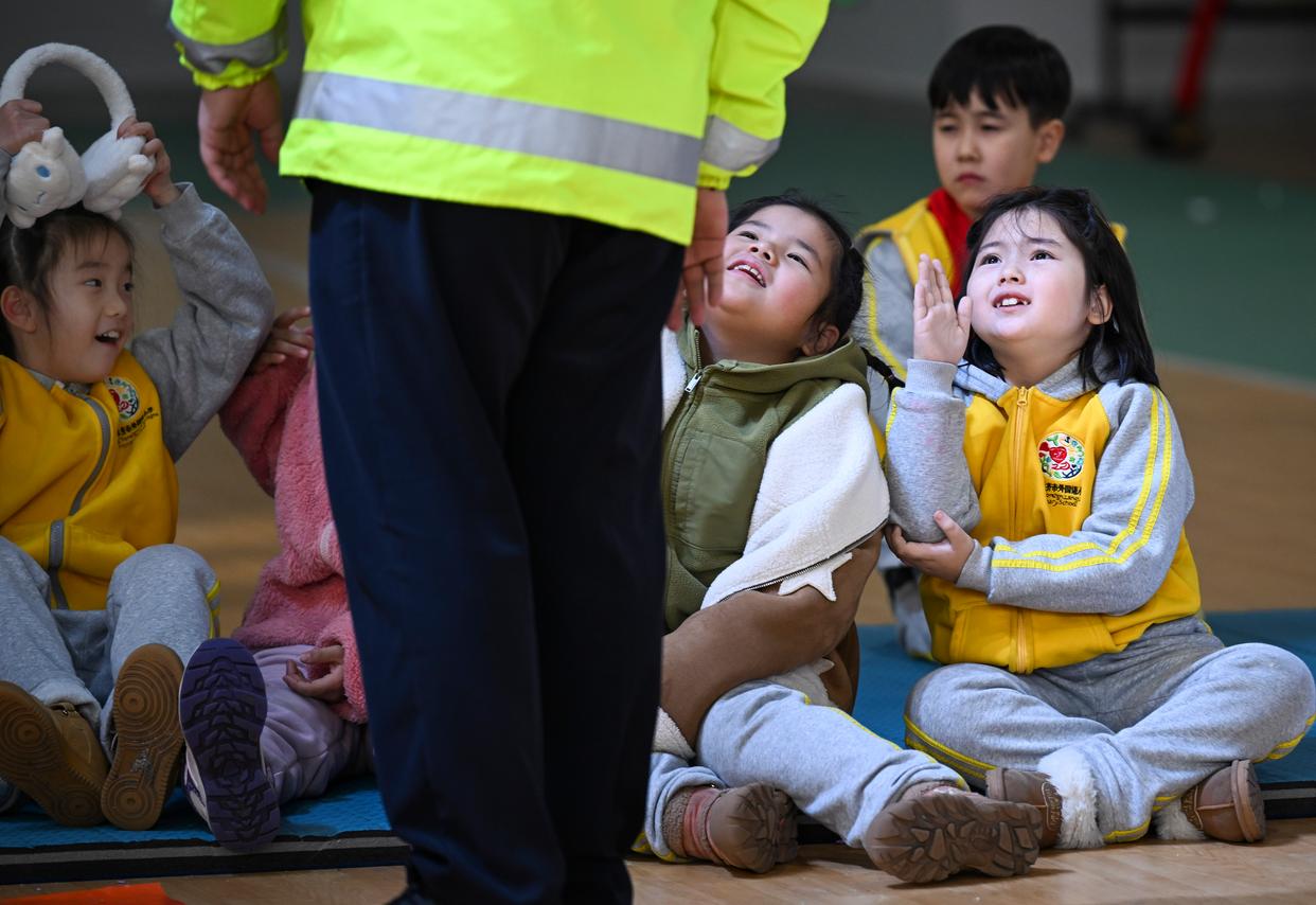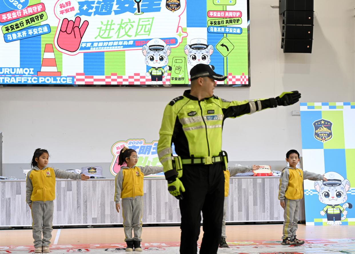 1月23日,在乌鲁木齐市第152小学,学生学习交通指挥手势。新华社记者 王菲 摄