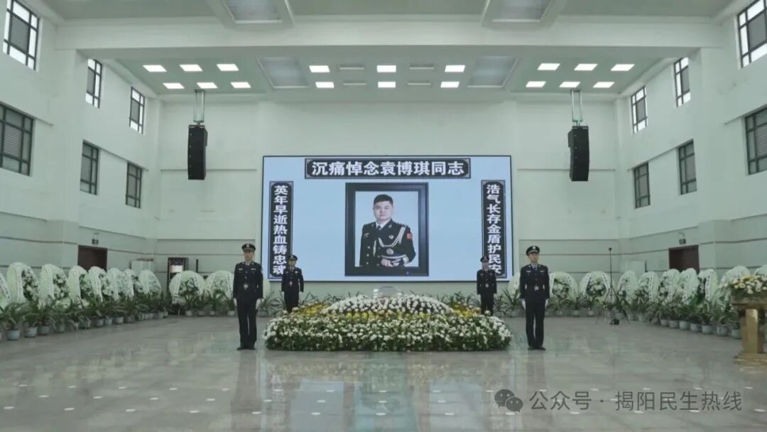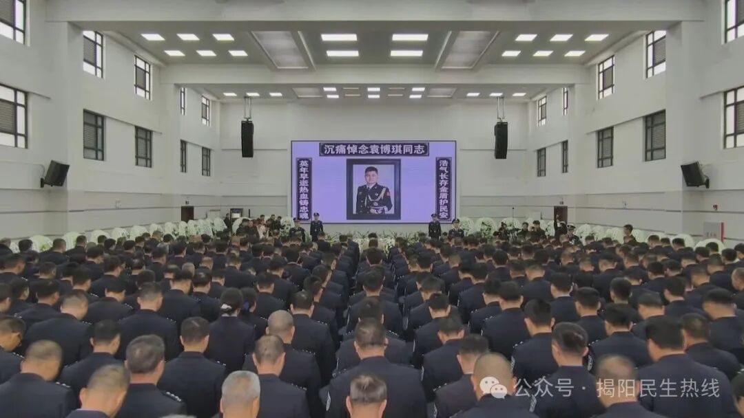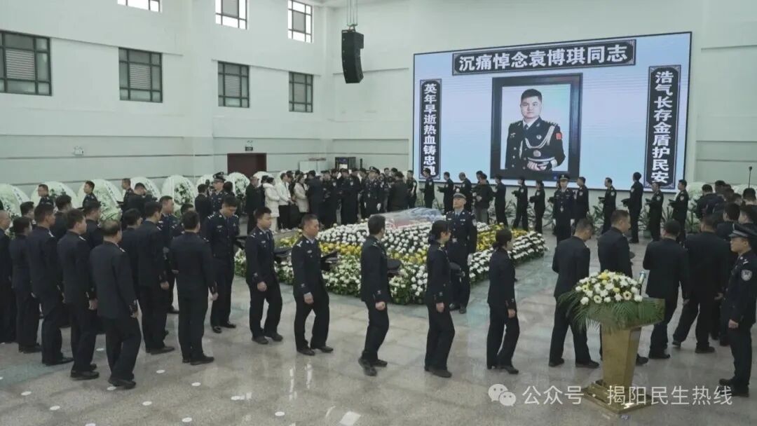 哀乐低回,青松垂泪。23日上午,揭阳市云山殡仪馆庄严肃穆,因公牺牲民警袁博琪同志遗体告别仪式在此举行。省公安厅领导、揭阳市、榕城区有关领导和干部代表,全市公安民警代表,袁博琪同志生前亲友共600多人一同参加,大家怀着沉痛的心情送别这位用生命践行人民警察誓言的时代楷模。
