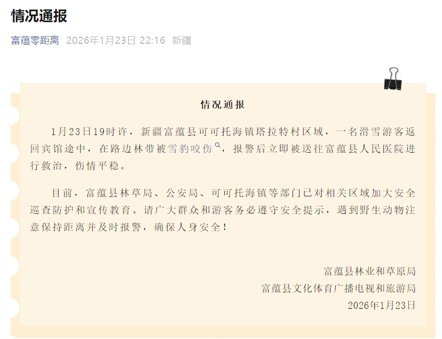 1月23日,在新疆富蕴县可可托海景区宝石沟附近,有游客拍到疑似雪豹袭人的视频。经当地派出所核实,有一名游客面部受伤,已转移到医院救治,目前没有生命危险。