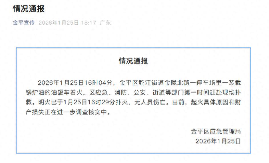 1月25日,广东汕头市金平区应急管理局发布情况通报:2026年1月25日16时04分,金平区鮀江街道金陇北路一停车场里一装载锅炉油的油罐车着火。区应急、消防、公安、街道等部门第一时间赶赴现场扑救。明火已于1月25日16时29分扑灭,无人员伤亡。目前,起火具体原因和财产损失正在进一步调查核实中。