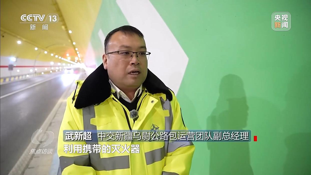 中交新疆乌尉公路包运营团队副总经理 武新超:花了两分多钟赶到现场,交警同志和应急人员利用携带的灭火器,第一时间对火灾进行了控制,整个处置过程用时不到5分钟。