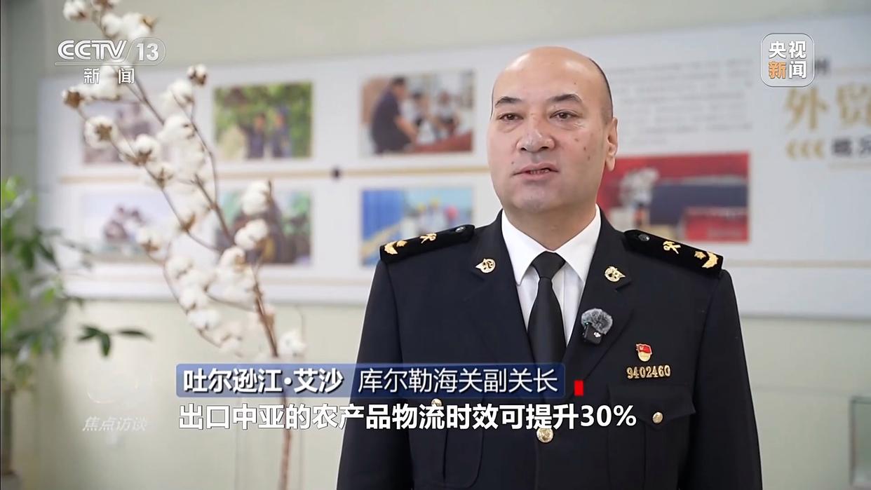 库尔勒海关副关长 吐尔逊江·艾沙:出口中亚的农产品物流时效可提升30%,大大带动巴州特色农产品、鲜食产品开拓中亚和欧洲市场。为了助力新疆发展,库尔勒海关对鲜活产品实行“随报随查、随查随放”,整体查验时间压缩60%。