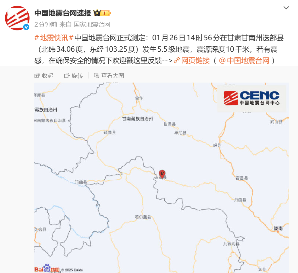 中国地震台网正式测定:1月26日14时56分在甘肃甘南州迭部县(北纬34.06度,东经103.25度)发生5.5级地震,震源深度10千米。