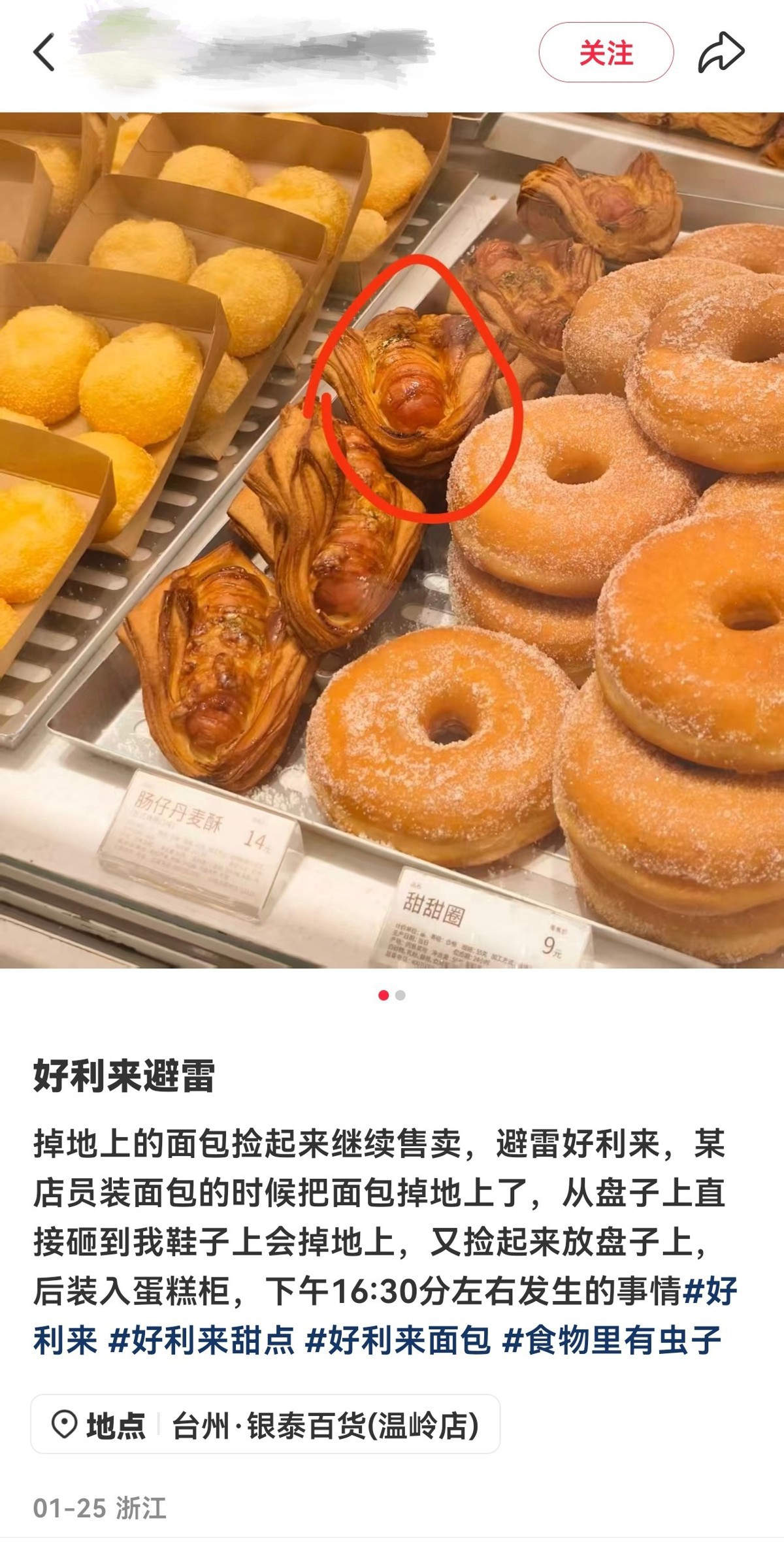 1月25日,一名网友在社交网站发帖称,好利来店内有面包掉落到其鞋子上后,又掉落在地上。随后店员将面包捡起,放回盘子上装入柜中。该帖子定位为温岭市一商场。