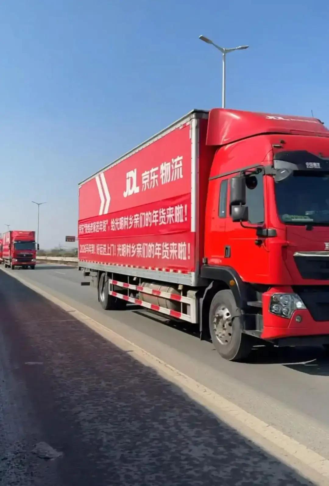 据悉,1月27日,刘强东给老家送年货的车队抵达光明村,在长达百米的送货车队中,两辆红色京东物流无人车分外显眼,为身后八辆9米6大货车“领航”。
