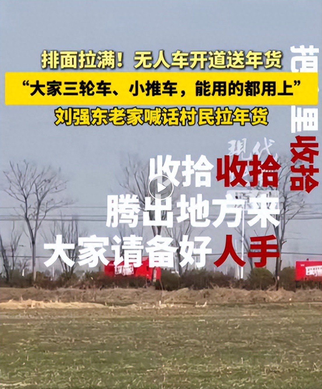 1月27日,京东集团创始人、京东集团董事局主席刘强东在老家宿迁光明村村委会通过广播喊话村民领年货,“后天29号早上10点,正式开始发年货!今年给每家每户的年货还是特别实在,大家把家里收拾收拾,腾出地方来,备好人手,三轮车、小推车,能用的都用上!”