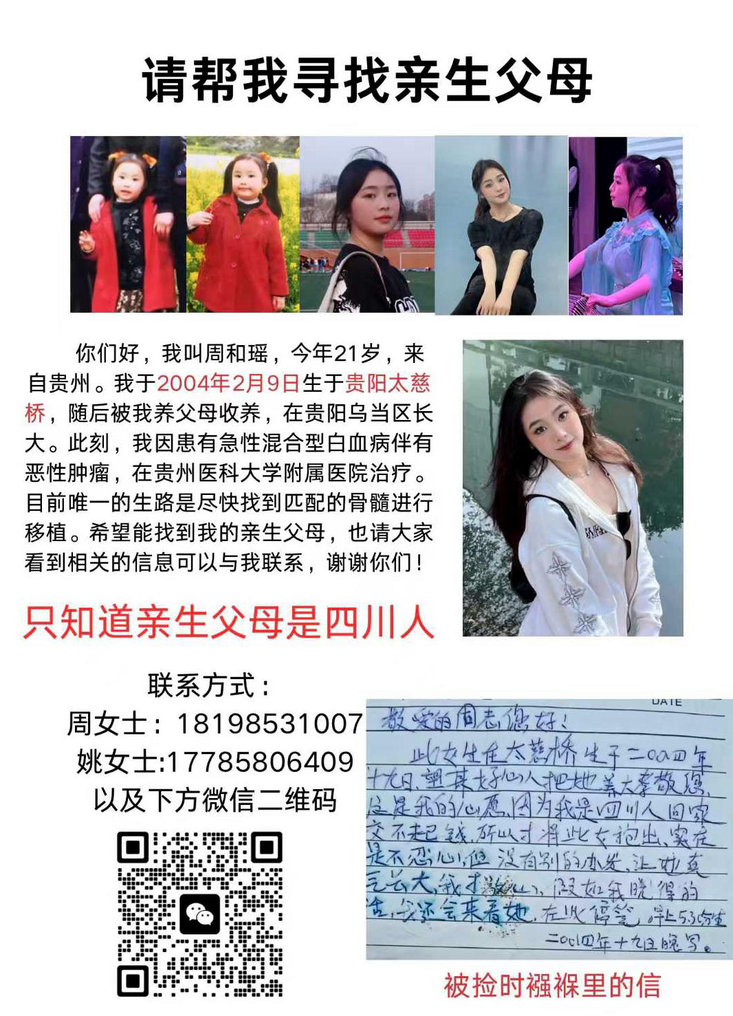 她身世的唯一线索,是养父母家捡到她时襁褓中留下的一张字条,显示其亲生父母或是四川人。今年1月,她在病危通知书上签下自己的名字后,这张字条成为她与病魔抗争的“希望”,急需骨髓移植的她决定寻找亲生父母,再给她一次“活下去的机会”。