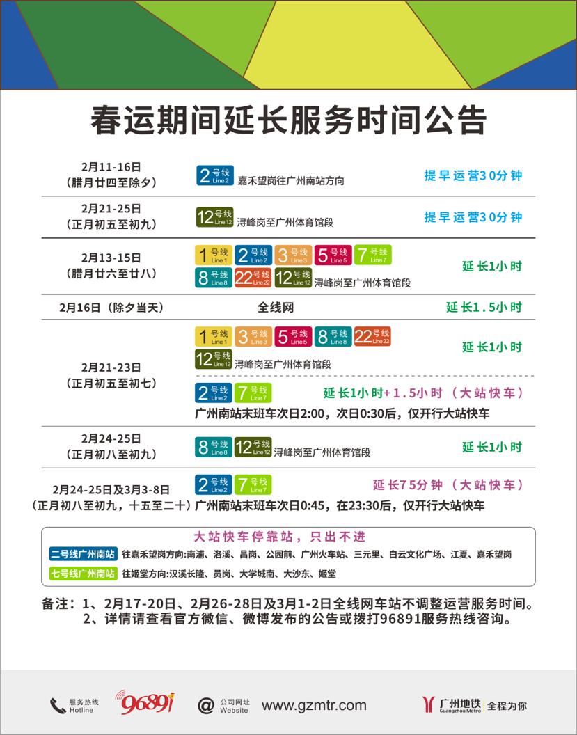 为方便铁路广州南站抵穗旅客,二、七号线将分阶段延长服务时间,期间加开从广州南站始发至嘉禾望岗和姬堂的夜间大站快车。其中,2月21至23日(农历正月初五至初七)延长2.5小时,次日0:30后仅开行大站快车,广州南站末班车为次日2:00;2月24至25日(农历正月初八至初九)及3月3至8日(农历正月十五至二十)延长75分钟,均为开行大站快车,广州南站末班车时间为次日0:45。需要注意的是,夜间大站快车中途停靠站点只出不进,二号线沿途停靠南浦、洛溪、昌岗、公园前、广州火车站、三元里、白云文化广场、江夏、嘉禾望岗;七号线则停靠汉溪长隆、员岗、大学城南、大沙东、姬堂。