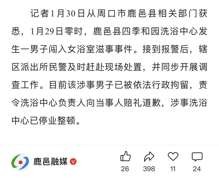 1月30日,鹿邑融媒发布消息称,1月29日零时,鹿邑县四季和园洗浴中心发生一男子闯入女浴室滋事事件。接到报警后,辖区派出所民警及时赶赴现场处置,并同步开展调查工作。目前该涉事男子已被依法行政拘留,责令洗浴中心负责人向当事人赔礼道歉,涉事洗浴中心已停业整顿。