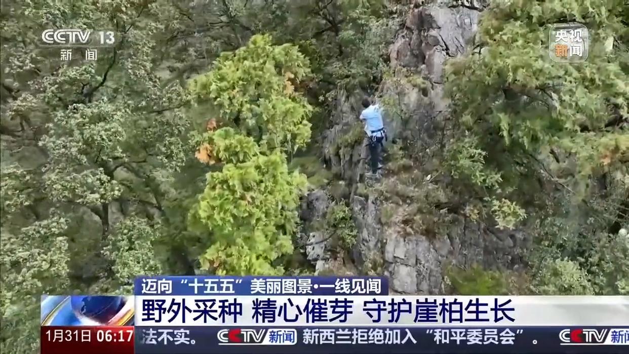 为了保护崖柏的树冠和嫩条,每次野外采种,工作人员都要用绳索牵引,爬上树用手去摘取种子。在重庆雪宝山国家级自然生态保护区工作4年的邬黎没少爬上崖顶和树梢。这些悄悄萌发的种子,有不少都是他亲手采摘。