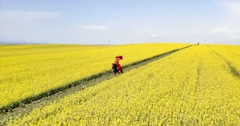 2022年,贺娇龙策马奔腾在昭苏油菜花田里。