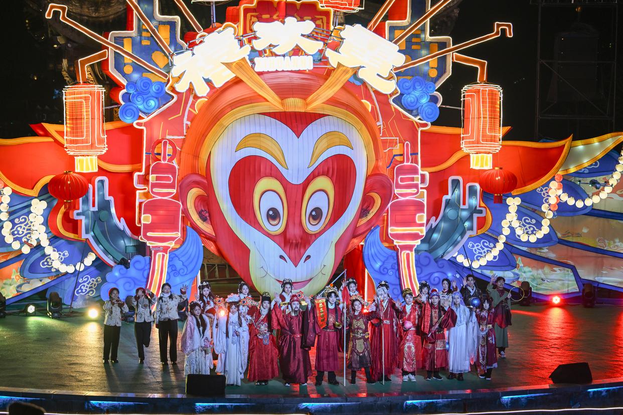 1月30日,重庆市园博园水上灯会现场,景区工作人员在舞台上与现场观众互动。新华社记者 陈诚 摄