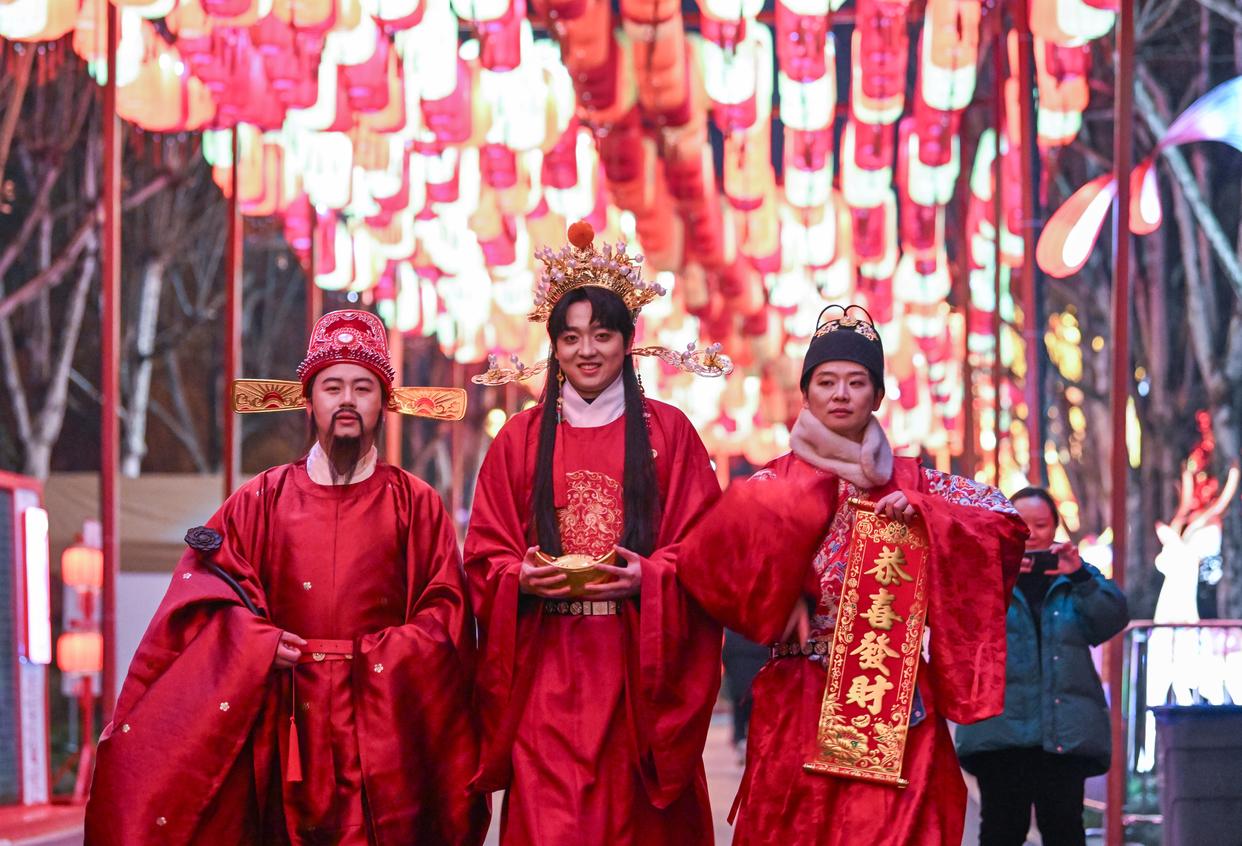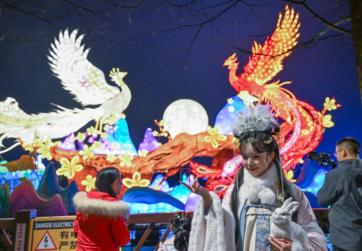1月30日,重庆市园博园水上灯会现场,景区工作人员(前右)在现场与游客互动。新华社记者 陈诚 摄