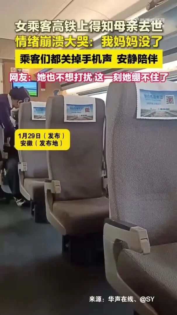 视频中,在一列高铁车厢里,一名女乘客接电话后崩溃大哭,高喊一句“我妈妈没了”。