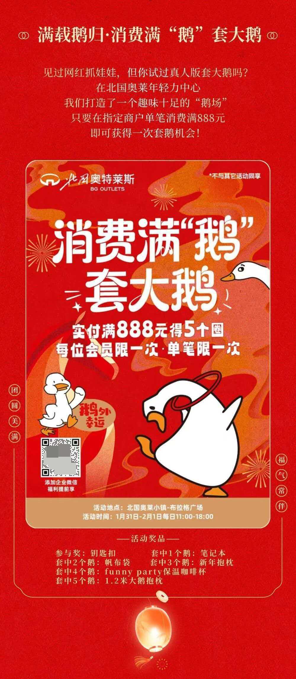 据该商场微信公众号1月30日发布的推文显示:北国奥莱周末放大招!消费满“鹅”套大鹅,实付满888元得5个圈,套中一个鹅送笔记本,套中二个鹅送帆布袋,套中三个鹅送新年抱枕,套中四个鹅送保温咖啡杯,套中五个鹅送1.2米大鹅抱枕。每位会员限一次,单笔限一次。活动地点:北国奥莱小镇布拉格广场,活动时间:1月31日-2月1日11:00-18:00。
