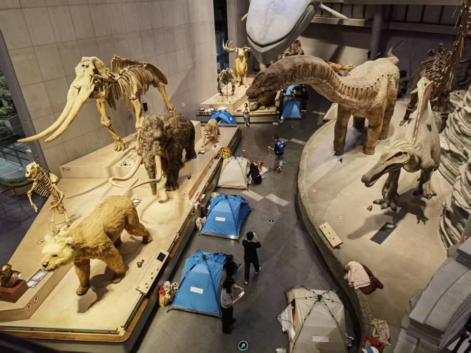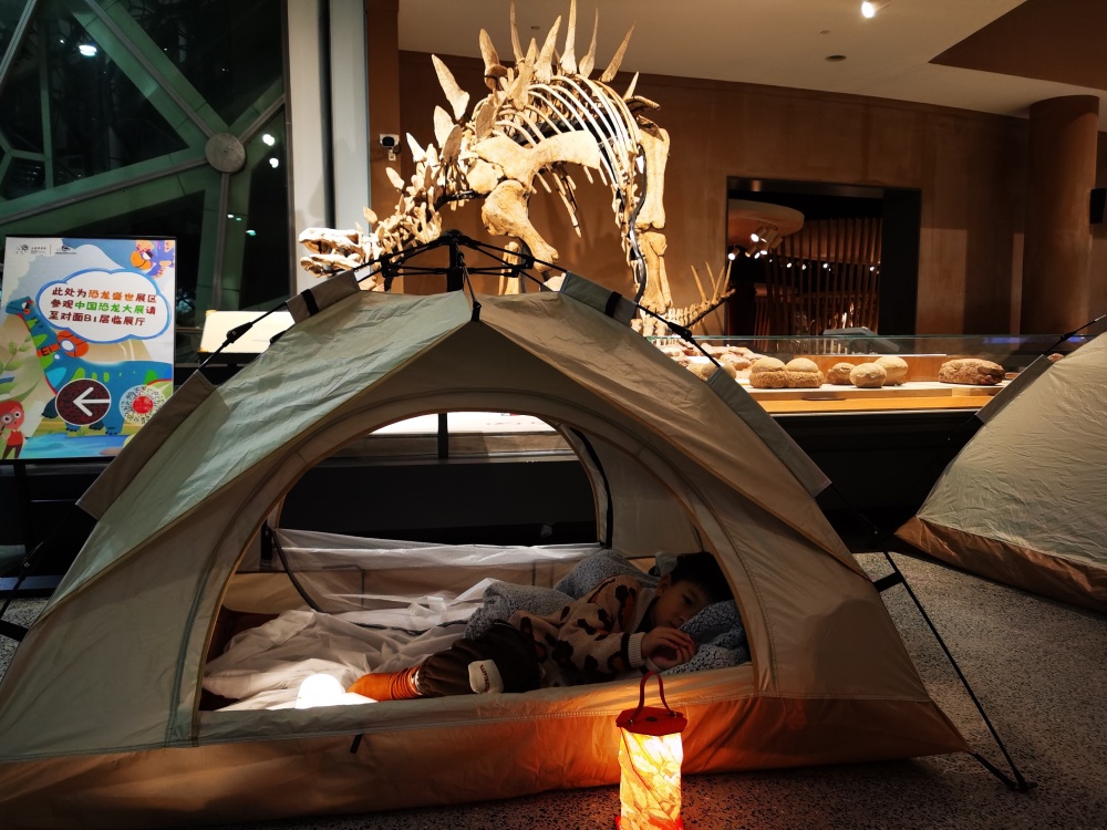 “帐篷一边是‘猛犸象’,一边是‘阿根廷龙’,抬头还有‘蓝鲸’;半夜醒来时透过帐篷的纱窗看到剑齿虎模型,虽然它没有直视我,但是锋利的牙齿仿佛下一秒就要咬住我,紧张又刺激。”13岁的郭睿和爸爸妈妈抽到了位于“生命长河”展区的夜宿点,这个展区云集来自不同地域和时期的200余件动植物标本和模型。
