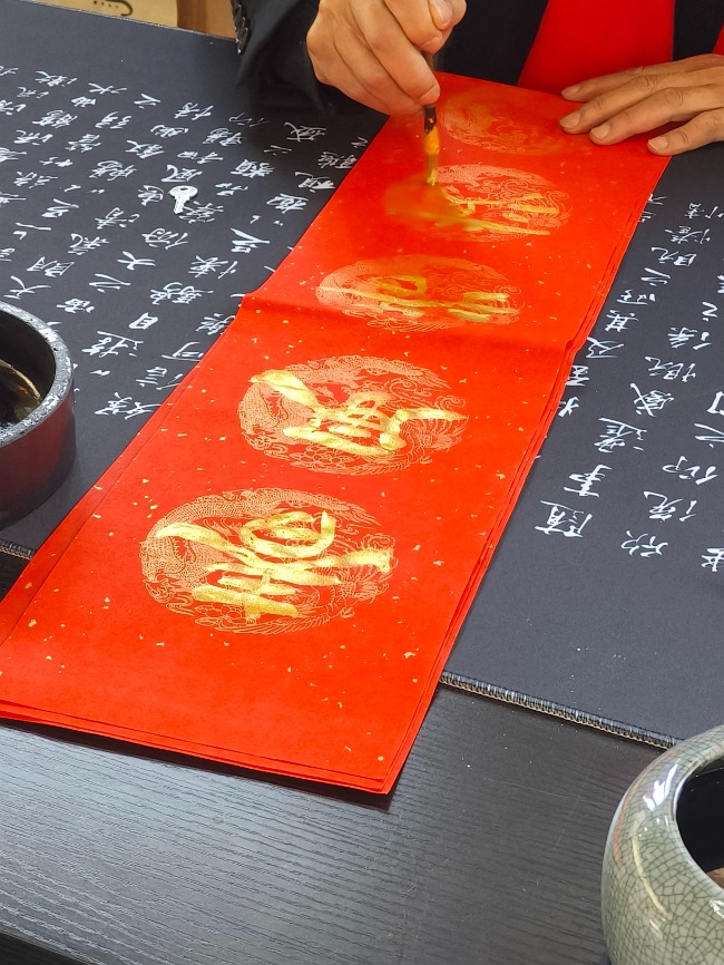 新春市集,怎能少了春联。当天,有书法老师为游客现场写春联,“我们用的是金墨,贴上了更显喜庆。”书法老师向记者介绍,他们应邀从外地赶来,并同步开启直播。“春联的内容这里有参考,也可以找自己喜欢的。”