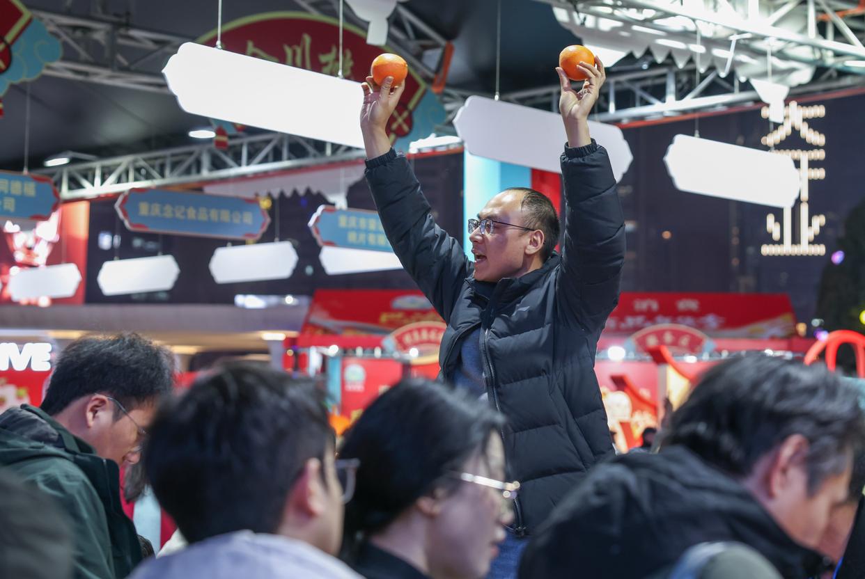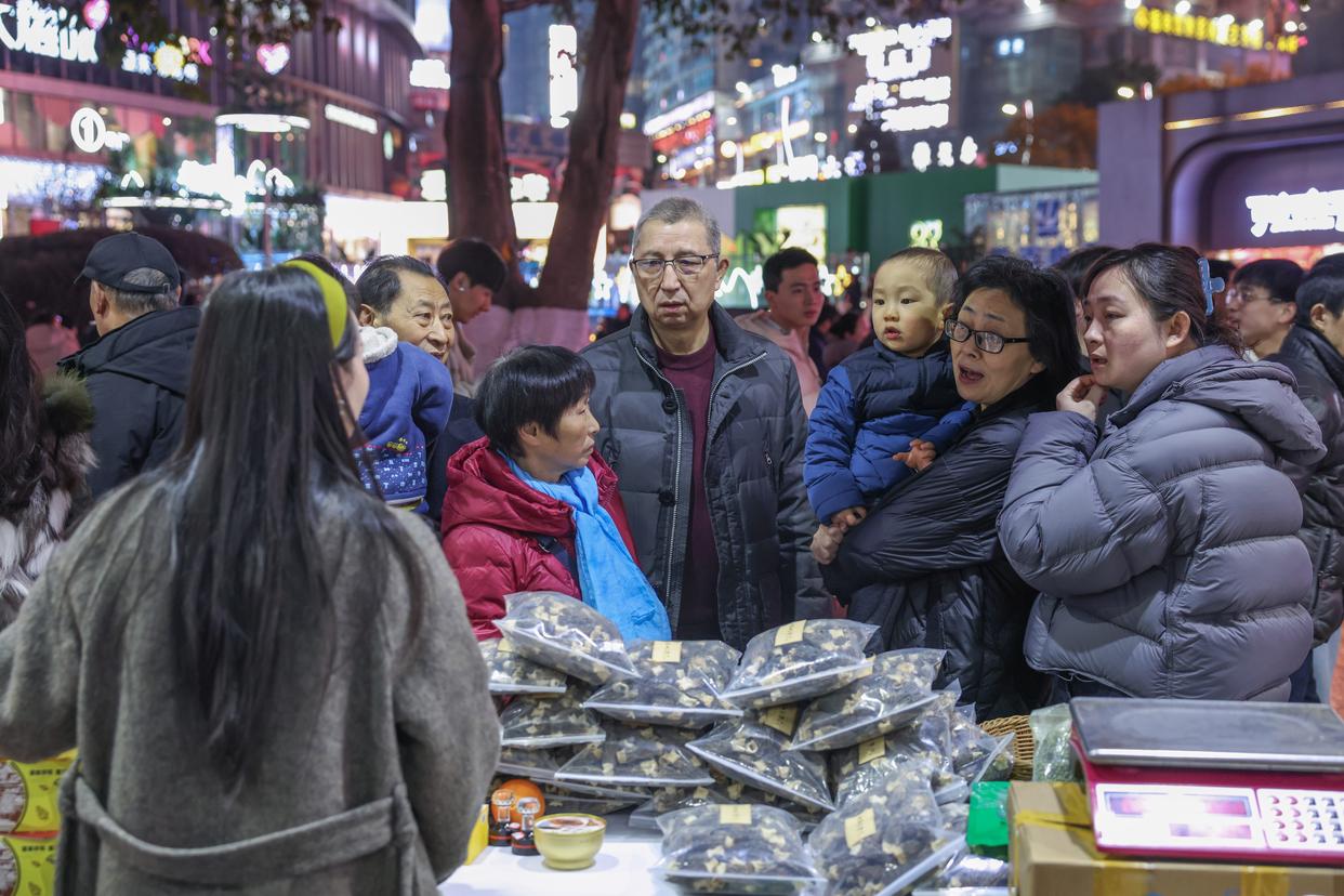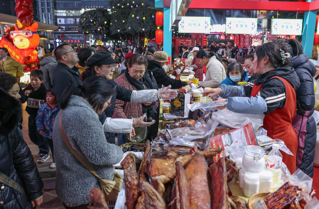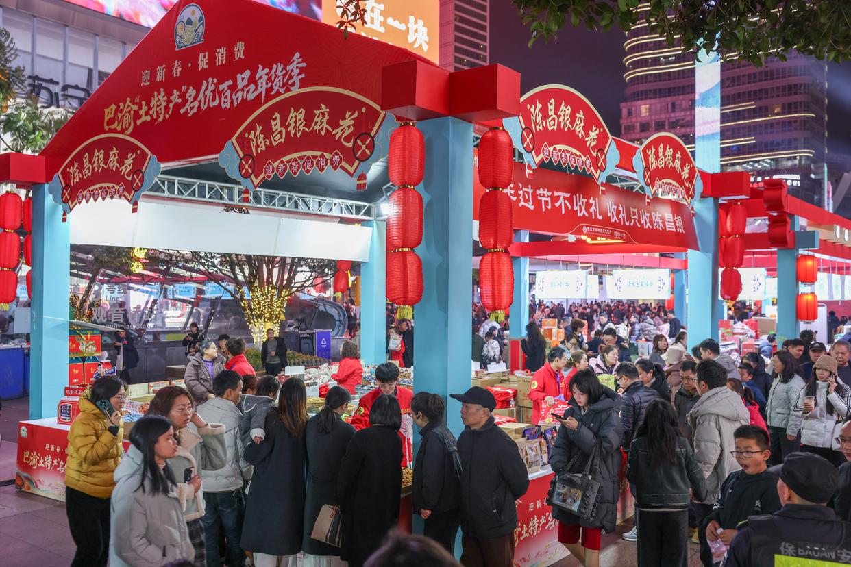 2月1日晚,重庆市两江新区观音桥步行街,市民在现场选购巴渝“土特产”。新华社记者 陈诚 摄